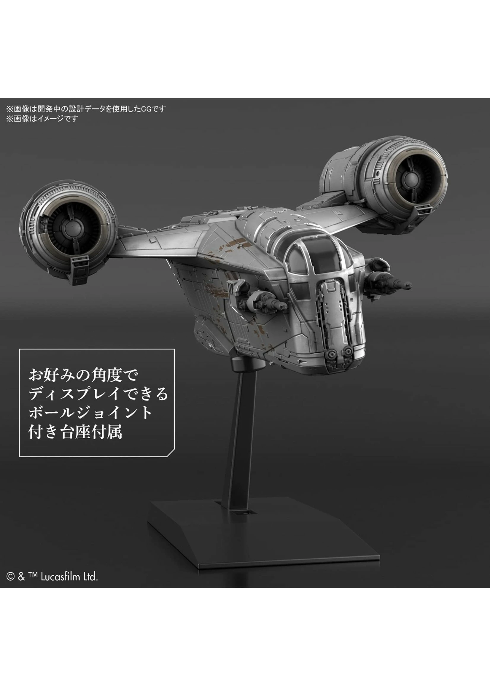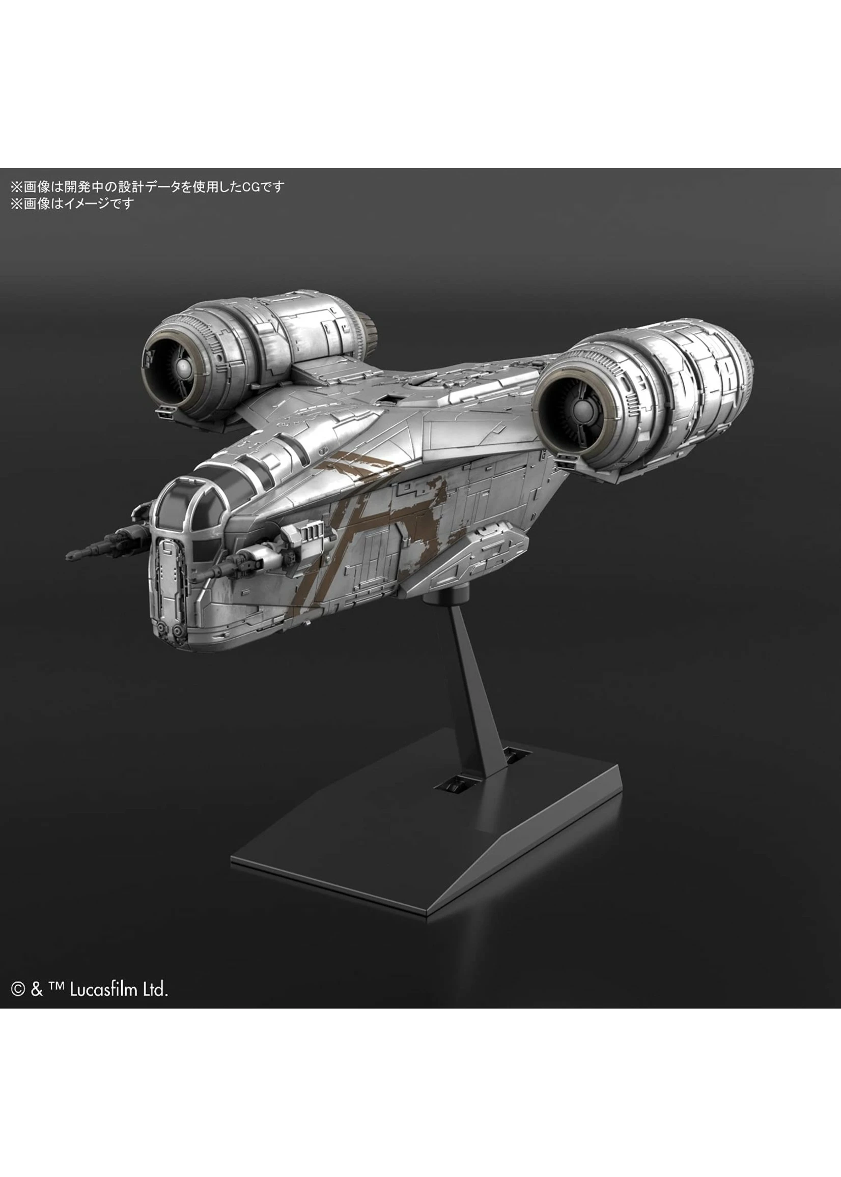 The Razor Crest, the armored transport shuttle from The Mandalorian, the first live-action Star Wars series is here. The ship’s heft is recreated with silver coating. A display base with a ball joint to display the kit at a preferred angle.