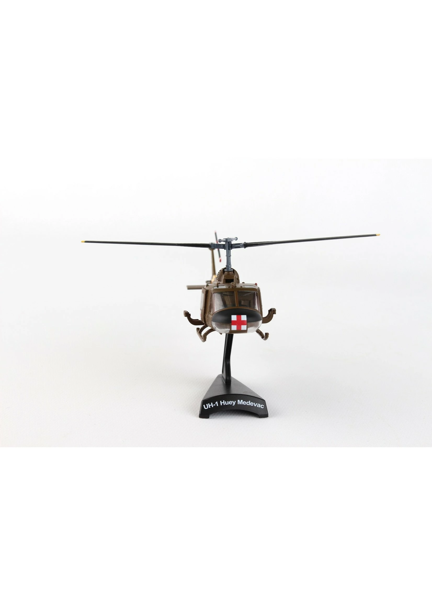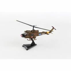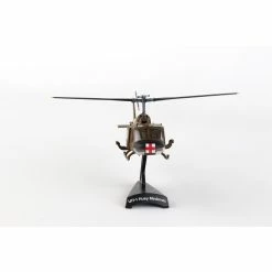This 1:87 scale Die-cast metal model is approximately 5 7/8 inches long with 5 1/2 inch rotor diameter. Tail rotor is 1 3/16 inches in diameter. Model’s maximum length is 7″ and maximum width is 5 1/2 inches. Comes with plastic display stand.
