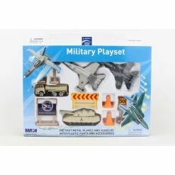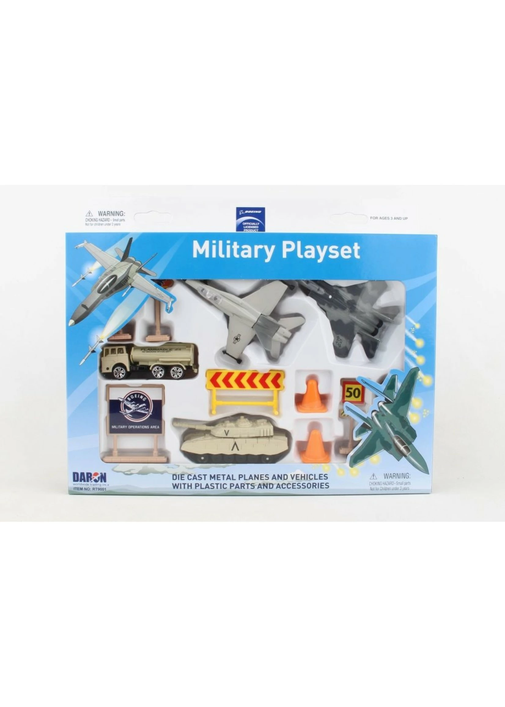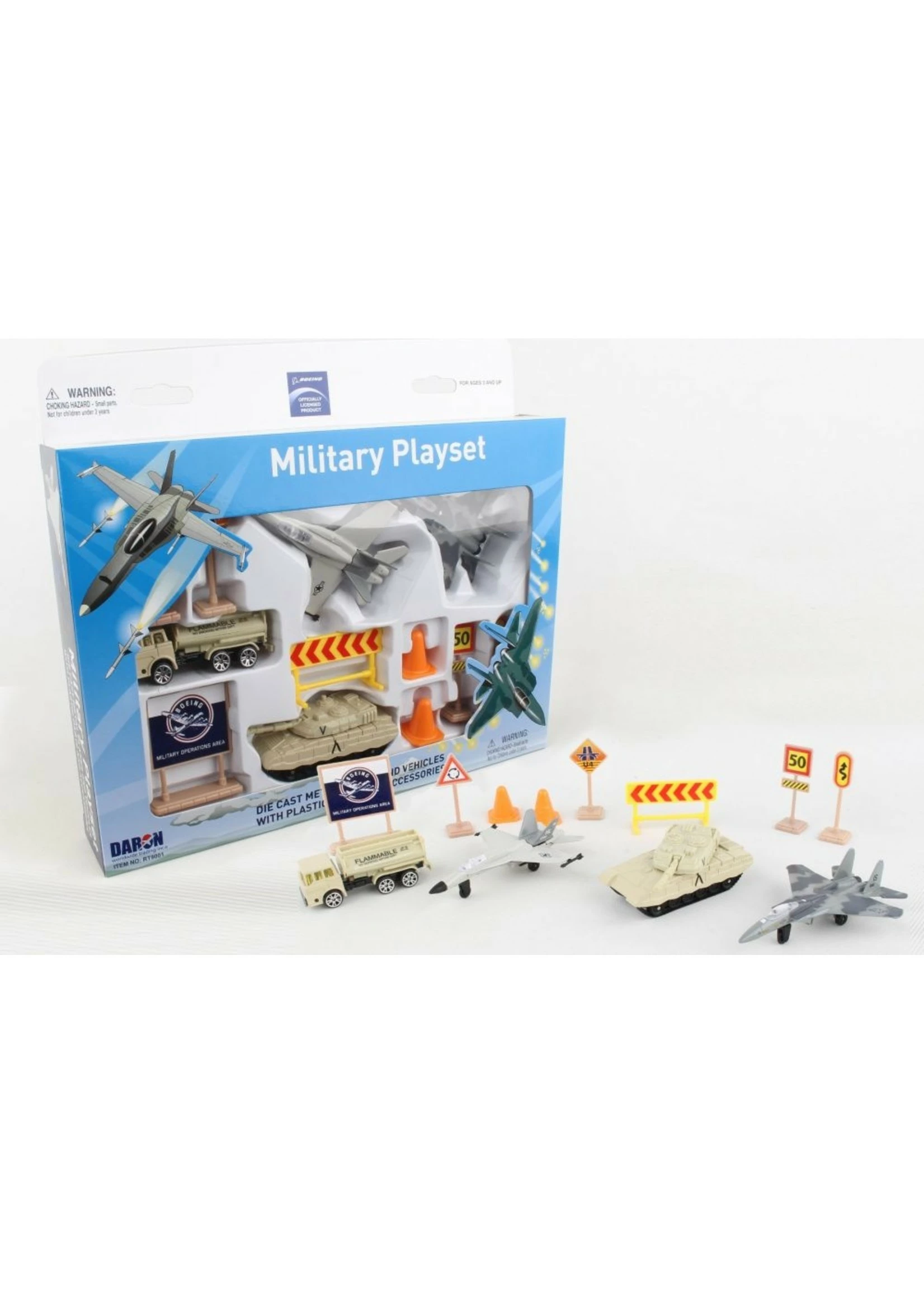 This Boeing military playset includes 2 aircraft, tank, vehicle and signs/accessories. Die-cast and plastic.