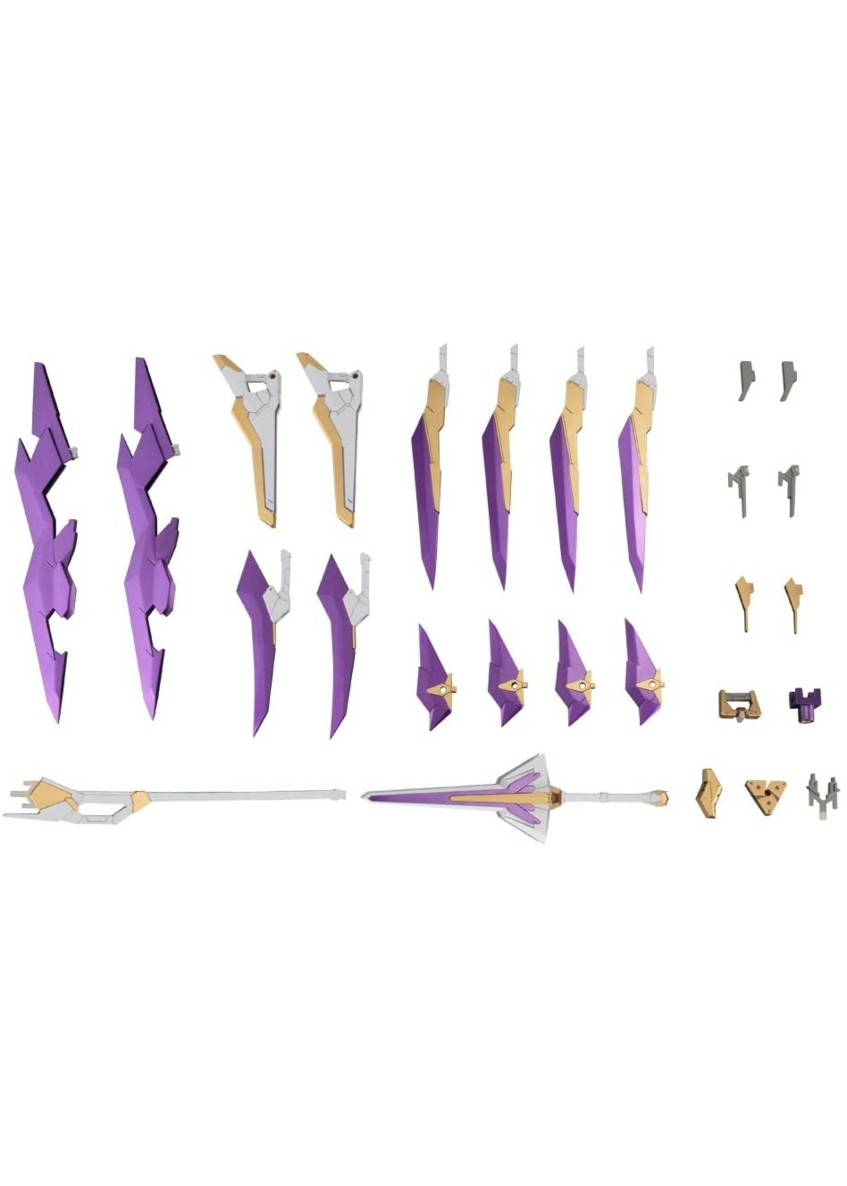 The swords, blades, staff parts, and more can be assembled in a number of ways to create unique equipment for your robots, or you can attach the pieces directly to armor for extra flair. Consisting of approximately 150 pieces molded in pre-colored purple, white, and gold plastic, these additions can be attached and displayed according to your preference!And while they were designed with the Ray Falx frame in mind, they are 100% compatible with any other robot in the Frame Arms lineup.