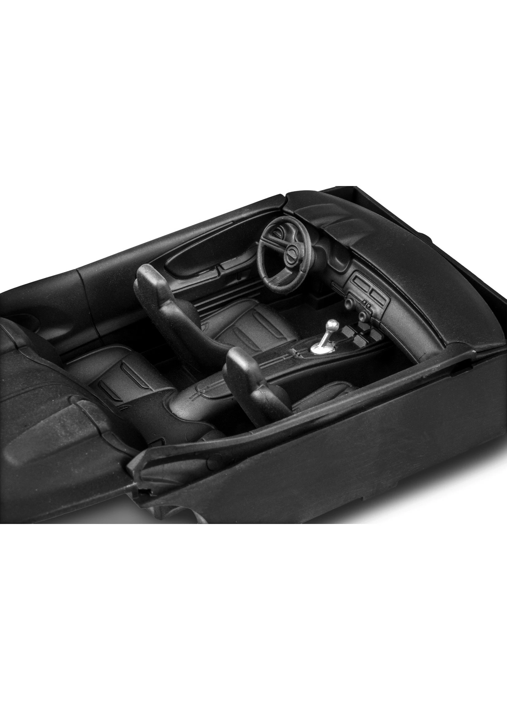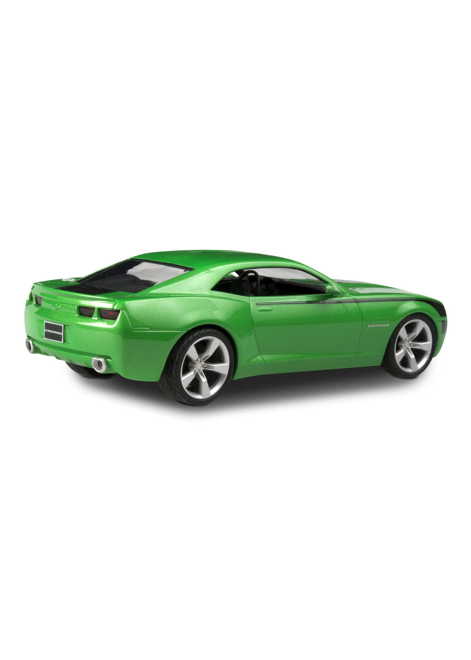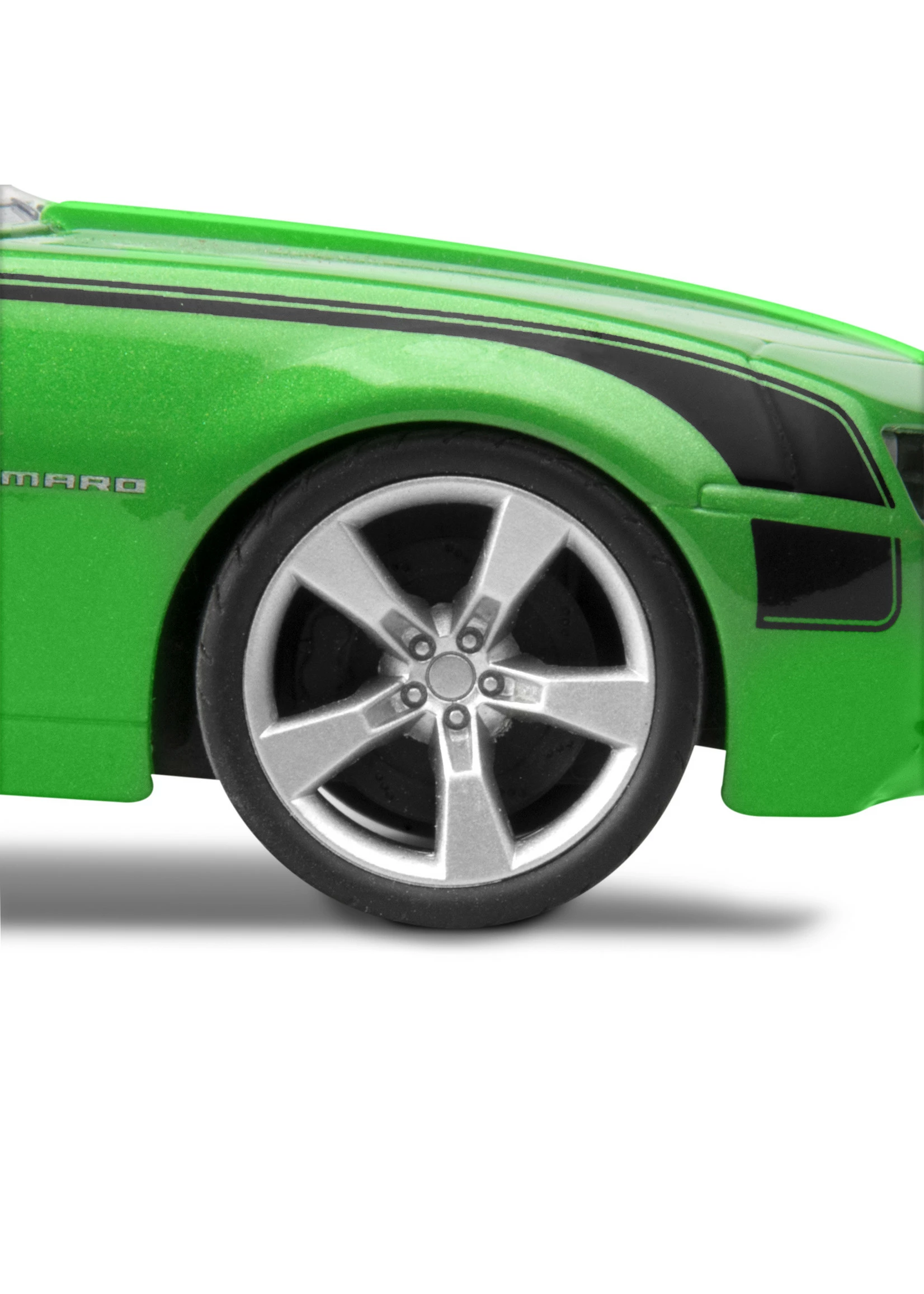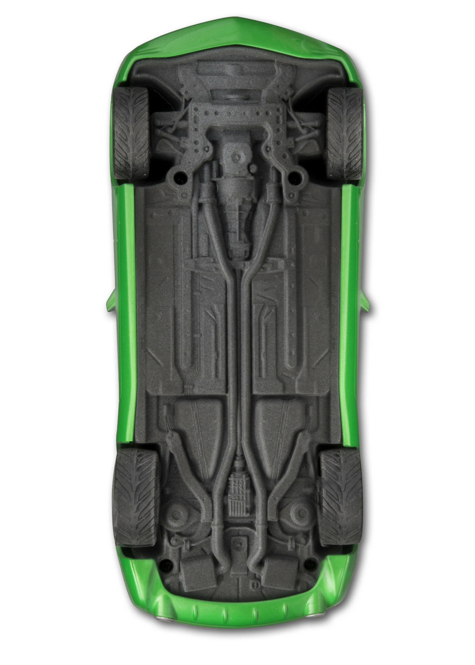 - Molded in lime green, black, transparent red and clear with chrome plated parts and soft black tires.