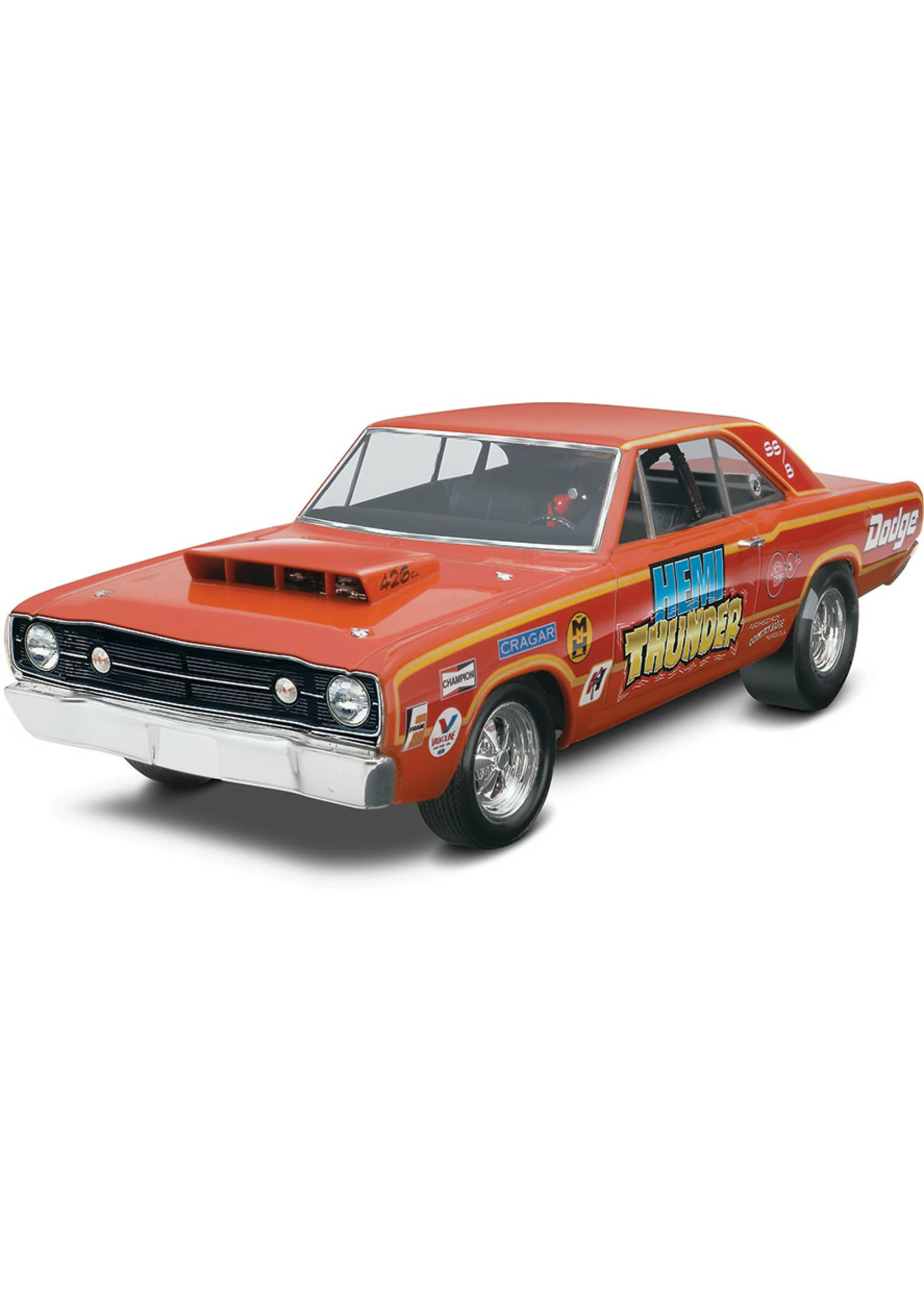 With its powerful 440 cu. in. engine, the 1968 Dodge Dart was one of the hottest cars of the year. Even hotter was a limited-run GTS Hardtop version equipped with a 426 cu. in. HEMI engine. This version was intended for use in supervised acceleration trials, not general highway use. Kit features a choice of a 426 cu. in. HEMI engine or a 440 cu. in. stock engine, a choice of stock or racing interiors and suspensions, soft black tires, chrome-plated parts and decals with stock or drag race markings.
