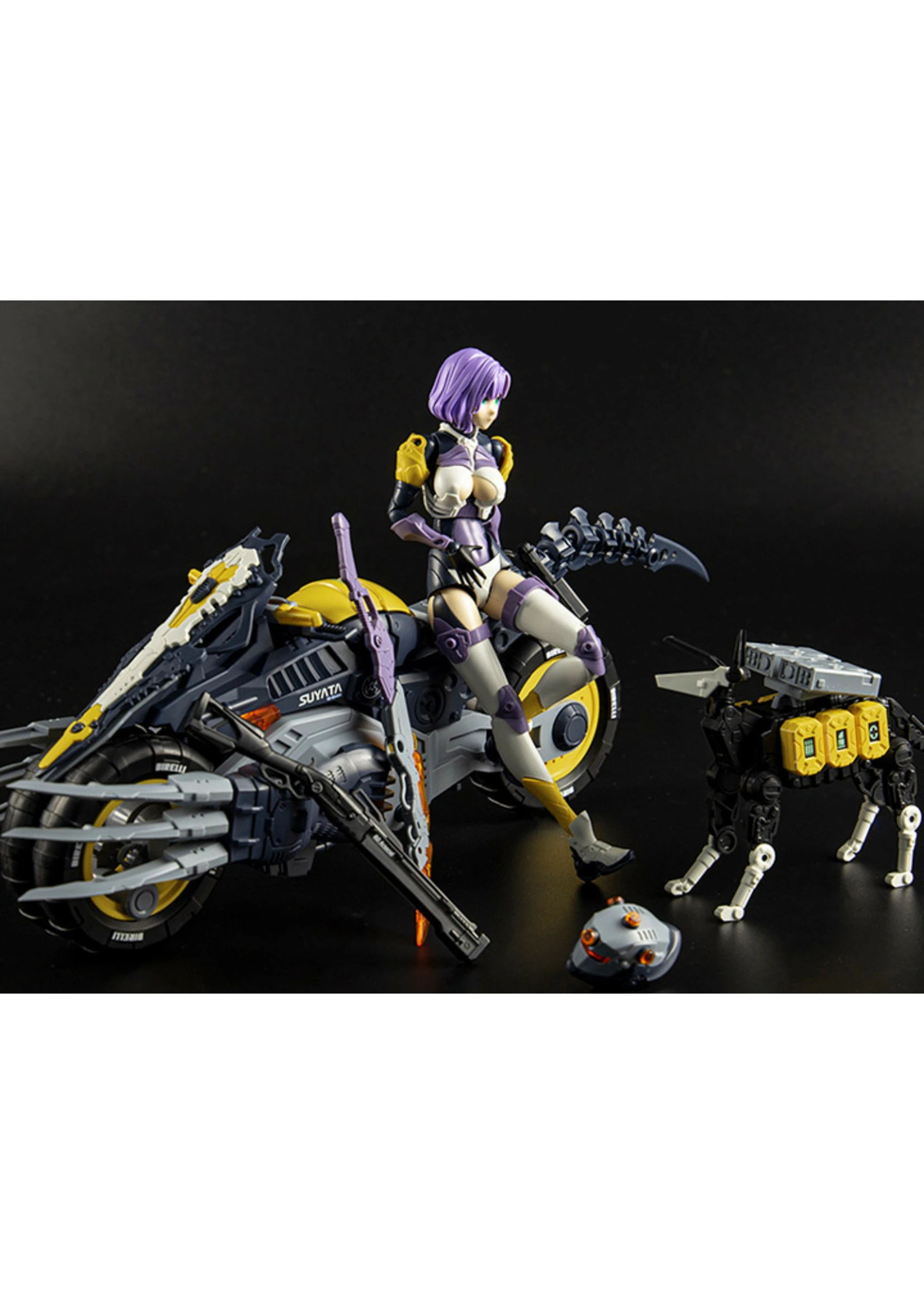 From Suyata, this 1/12 scale model kit of The Hunter’s Poem Cyber Girl Arya is here! Sitting on a menacing cycle, with a plethora of weaponry and a cyber dog, this model kit is a great addition to any mecha or anime collection.