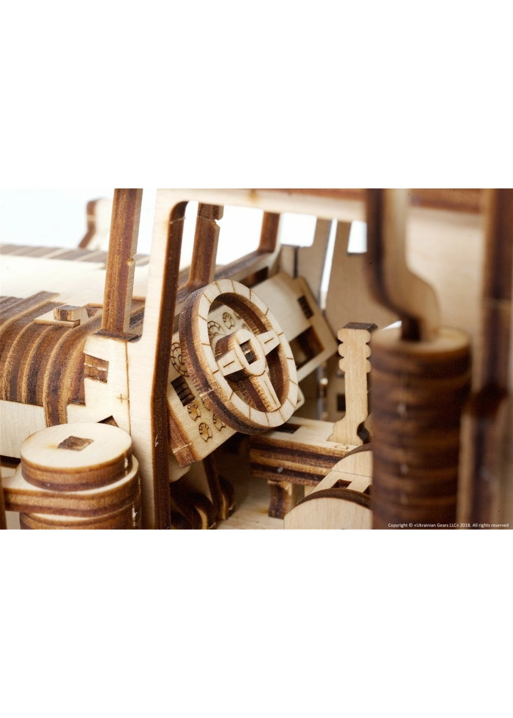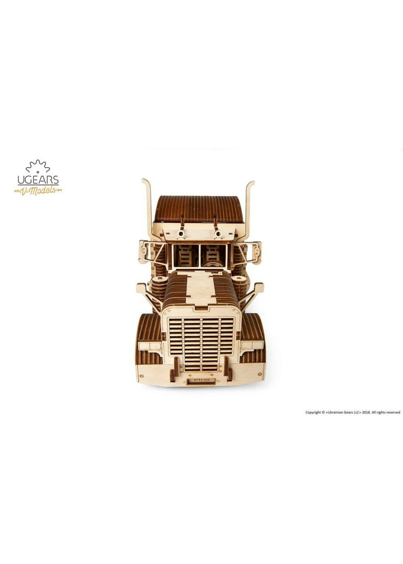 Robust and powerful, the Ugears long-hauler has a R6 engine driven by a rubber band motor. With one winding, the truck can go for about 5 meters. The transmission system implemented in the model has three modes: forward, back and idle. The front sprung wheels turn to set the direction.